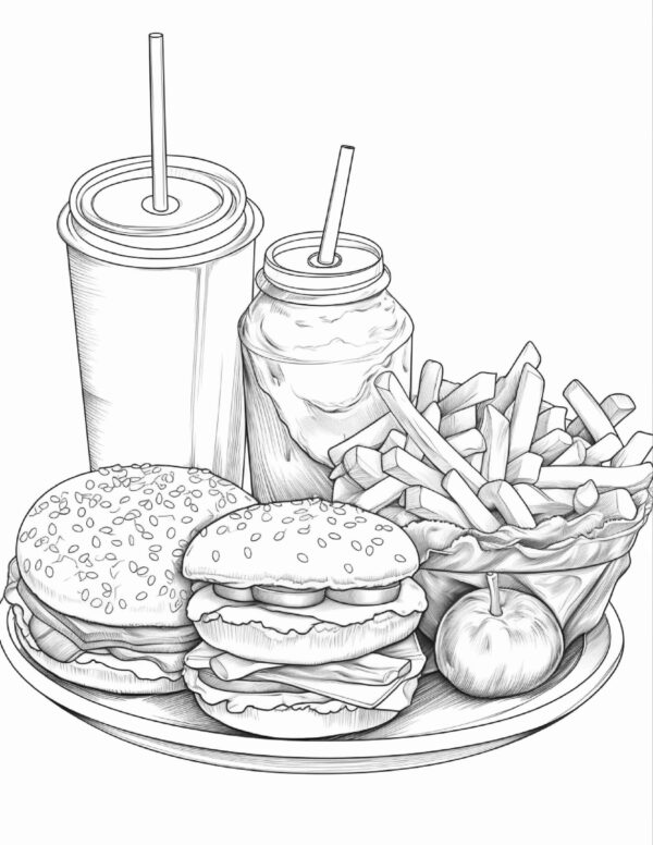 indulge in a delightful journey of creativity and relaxation with our Fast Food Coloring Pages for Adults. Designed to whisk you away from the stresses of daily life, this interior download offers: